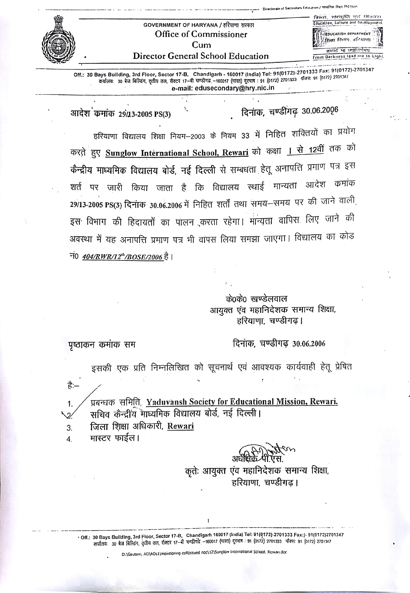 Recognized by the Directorate of Education, and affiliated to the Central Board of Secondary Education (C.B.S.E), the largest educational board in India, Sunglow International School aims at providing excellent educational facilities and the right environment for the development of Physical, Intellectual, Emotional and Spiritual quotients with a view to produce total quality scholars preparing them to face challenges of modern information and knowledge based society.
